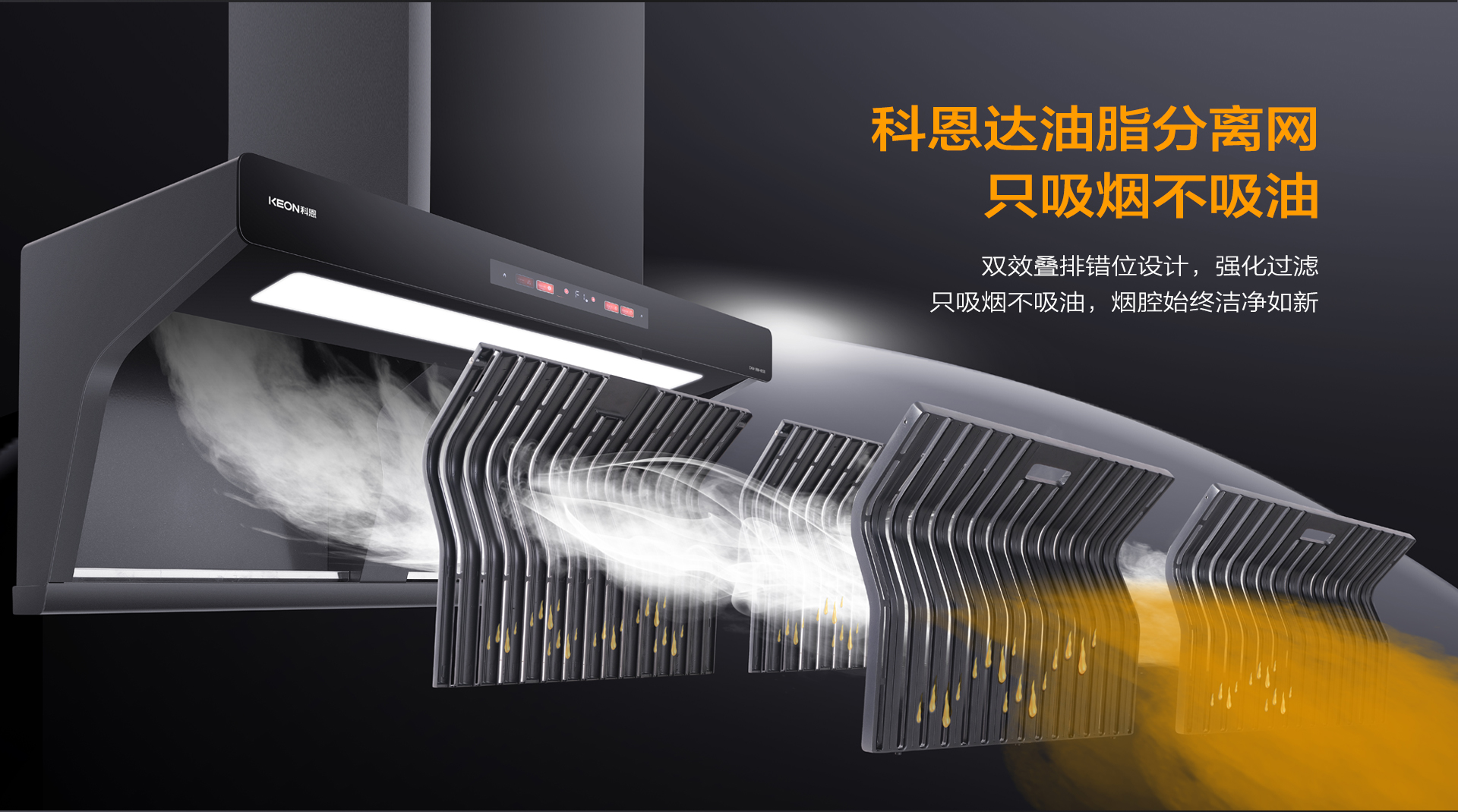 科恩免清洗煙機是浙江科恩電器有限公司旗下產品,歷時3年研發,于2023年重磅推出。免清洗煙機一經推出,便受到行業和市場的熱情追捧。其核心的科恩達油脂分離網憑借嚴格苛刻的高溫噴砂特氟龍易潔工藝以及科恩達油脂分離網U型錯層科學結構設計,做到油煙可被快速分離,油脂高效冷凝,同時,能更好地起到阻火阻燃的效果!真正做到只吸煙不吸油,徹底告別煙機內部清洗難題,保證煙機持久大吸力,延長煙機使用壽命。