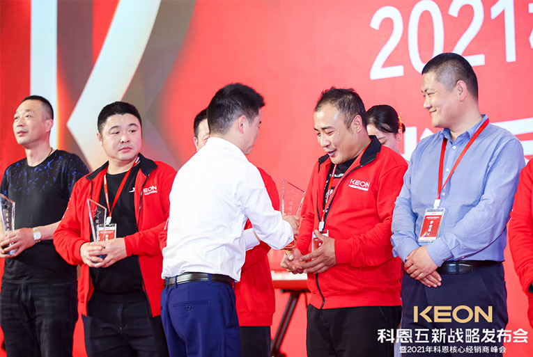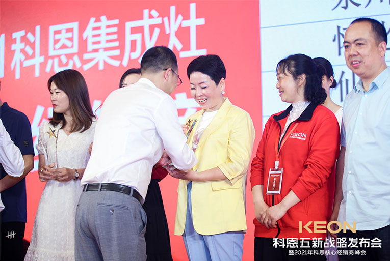 科恩電器一路披荊斬棘,成功實現了一輪又一輪銷量的突破,這一切的成果都離不開終端經銷商的努力與付出。晚宴現場對科恩電器優秀經銷商進行了表彰獎勵,頒發了2020年度科恩電器優秀專賣店、2020年度科恩電器優秀經銷商、2020年度科恩電器杰出經銷商、2020年度科恩電器卓越經銷商、2020年度科恩電器功勛經銷商等在內的多項大獎,公司高管上臺授予榮譽。