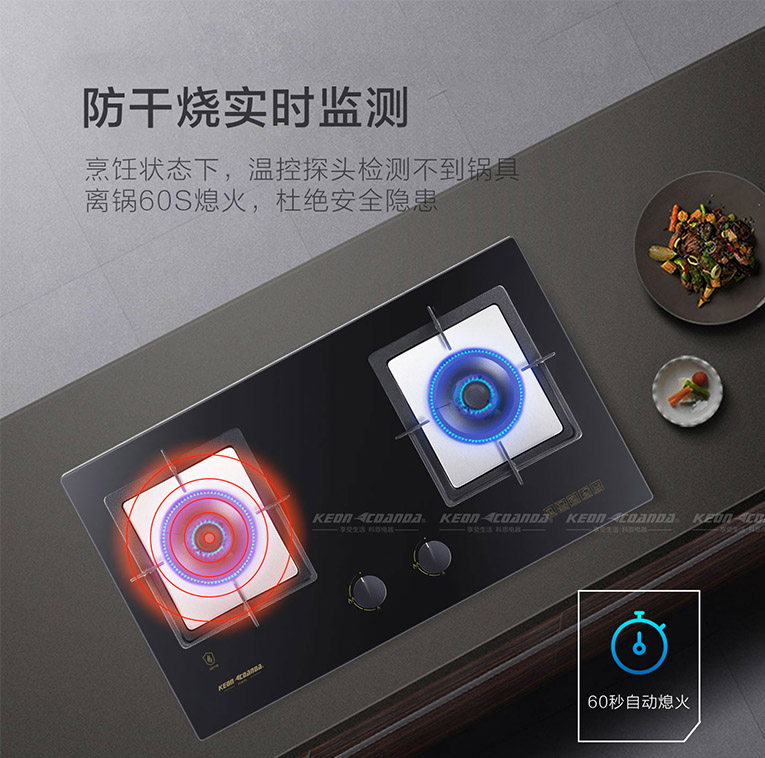 說起防干燒,其實(shí)是燃?xì)庠钕ɑ鸨Wo(hù)裝置的一大技術(shù)突破,防干燒技術(shù)則是采用溫控傳感器和熱敏電阻感應(yīng)的方式,搭配實(shí)時(shí)監(jiān)測(cè)功能,這樣在使用時(shí)更顯智能化和人性化。相比市面上普通防干燒灶具,集成灶十大品牌、廚電行業(yè)十大品牌科恩KN610智能防干燒灶具技術(shù)更為優(yōu)越,在溫度檢測(cè)上,普通防干燒在超過298℃后才能啟動(dòng)熄火保護(hù),而KN610在溫度達(dá)到280℃時(shí)就能斷氣,另外,烹飪狀態(tài)下,溫控探頭檢測(cè)不到鍋具60S時(shí)也將自動(dòng)熄火,有效杜絕了安全隱患!