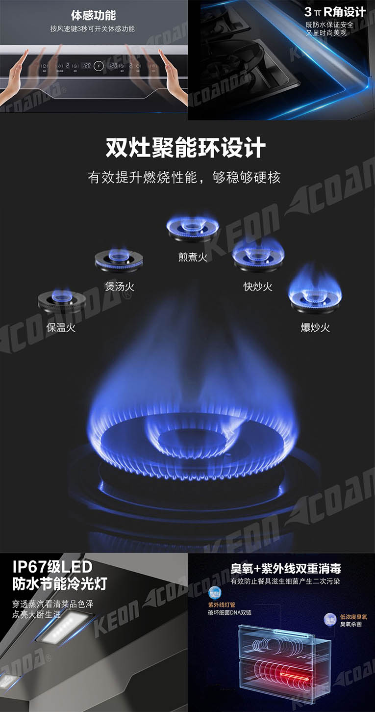 520告白季,科恩D520煙灶消款集成灶前來助陣,低空近吸體感操控,按風(fēng)俗健3秒可開關(guān)體感功能,3πR角設(shè)計,既防水保證安全,又顯高端時尚,雙灶聚能環(huán)5.0KW強大火力,爆炒更有勁,煲湯更有味,1-99分鐘自由選擇,烹飪完成時自動熄火,開關(guān)紅外線2秒延時,防止了誤觸,同時產(chǎn)品采用一鍵自動清洗,減輕你美麗雙手負(fù)擔(dān),內(nèi)部一鍵自動清潔。消毒柜采用臭氧+紫外線雙重消毒,有效防止了餐具滋生細(xì)菌產(chǎn)生的二次污染,西門子冰箱門拉手,貼心高氧化鈦合金材質(zhì),耐用又好看!愛她,就要保護(hù)她,科恩D520集成灶,給她全方位的守護(hù)!
