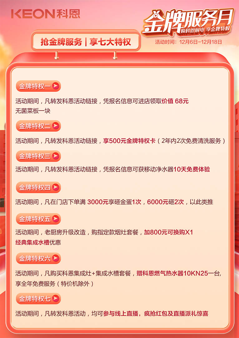 踐行科恩12余年來一直給予消費者的服務(wù)承諾,特此元旦新春佳節(jié)到來之際,舉辦“金牌服務(wù)月”活動,購科恩廚電,享金牌特權(quán),為您的健康廚房保駕護航!科恩“金牌服務(wù)月”火熱進行中,七大特權(quán)助力活動圓滿成功!