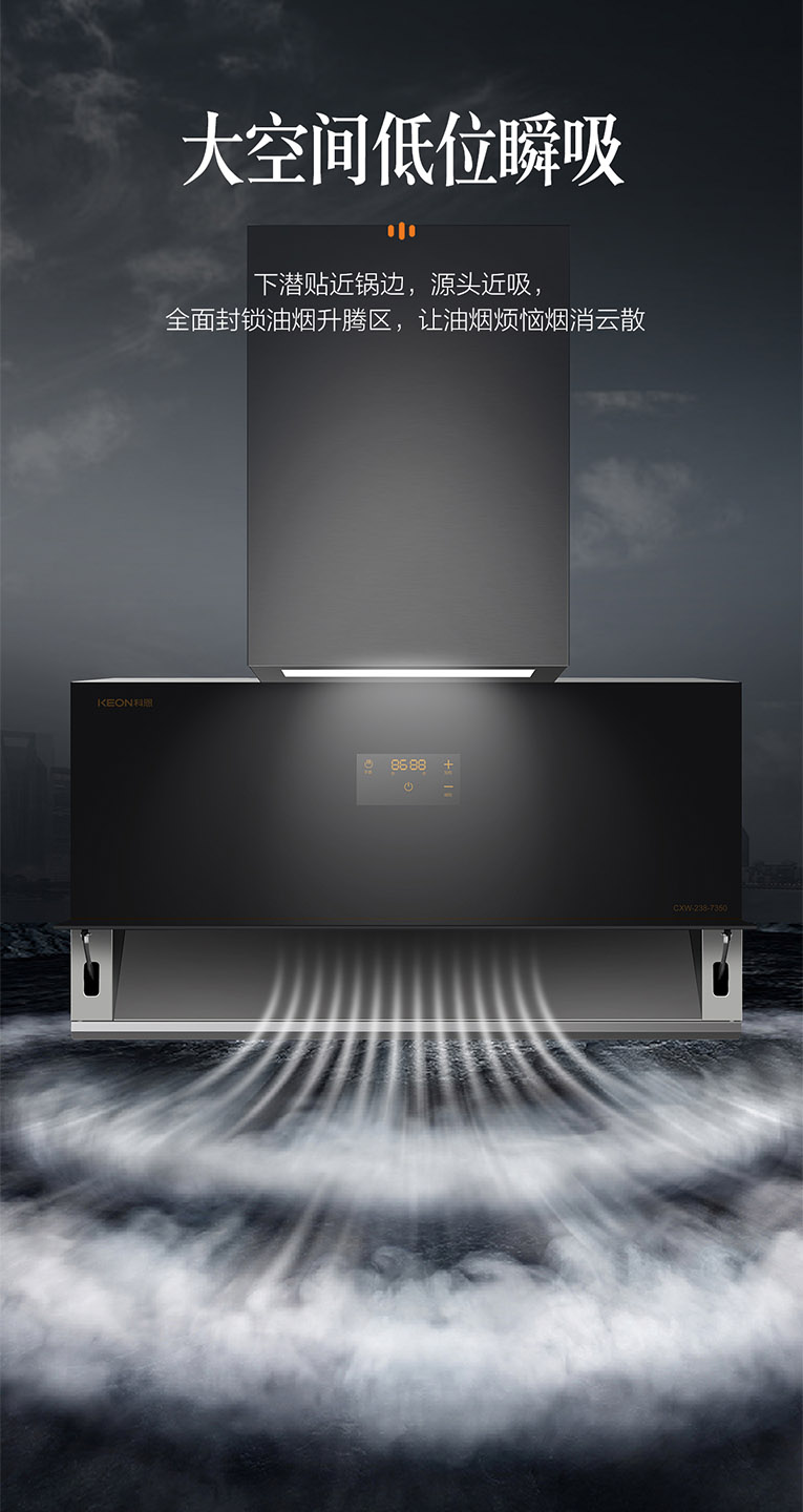 集成灶十大品牌、廚電行業十大品牌科恩新一代7350變頻大吸力煙機,變頻新科技,重新定義大吸力,能針對復雜的烹飪環境、多變的公共煙道風阻,19.5±10%大風量,800Pa大風壓,能夠快速突破風壓極限,遇強則強,八檔風速迅速調節,達到最佳抽油煙機效果,而當煙道內壓力較小時,煙機則自動調節轉速風壓,保持恒定大吸力,確保油煙不逃逸、不倒灌,能有效解決油煙跑煙問題。