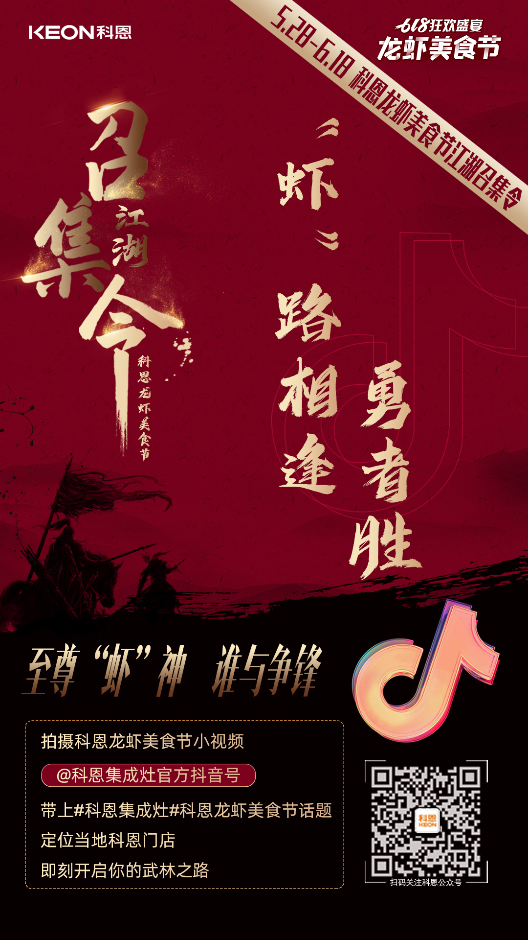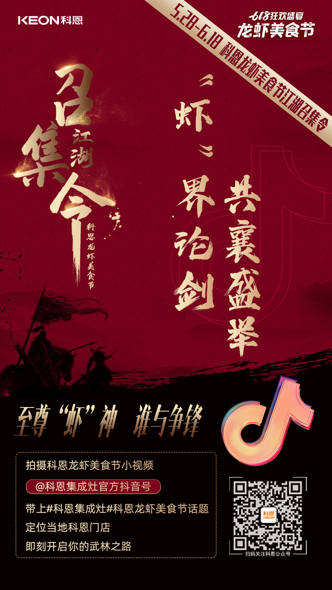 各位俠士,請(qǐng)妥存這份武林大會(huì)規(guī)則寶典,江湖美味,缺你不可!只要關(guān)聯(lián)科恩龍蝦美食節(jié),體現(xiàn)科恩元素并上傳至私人抖音號(hào),@浙江科恩電器有限公司官方抖音號(hào),帶上話題#科恩龍蝦美食節(jié) #科恩集成灶,定位當(dāng)?shù)乜贫鏖T店位置即可!