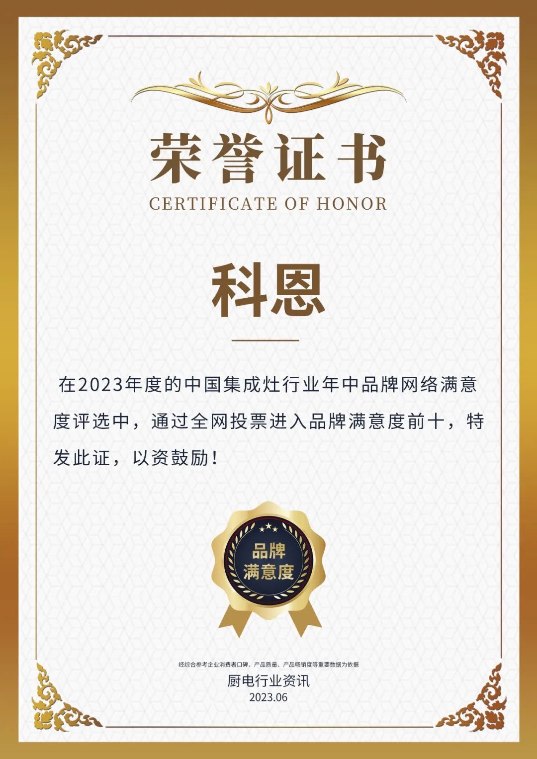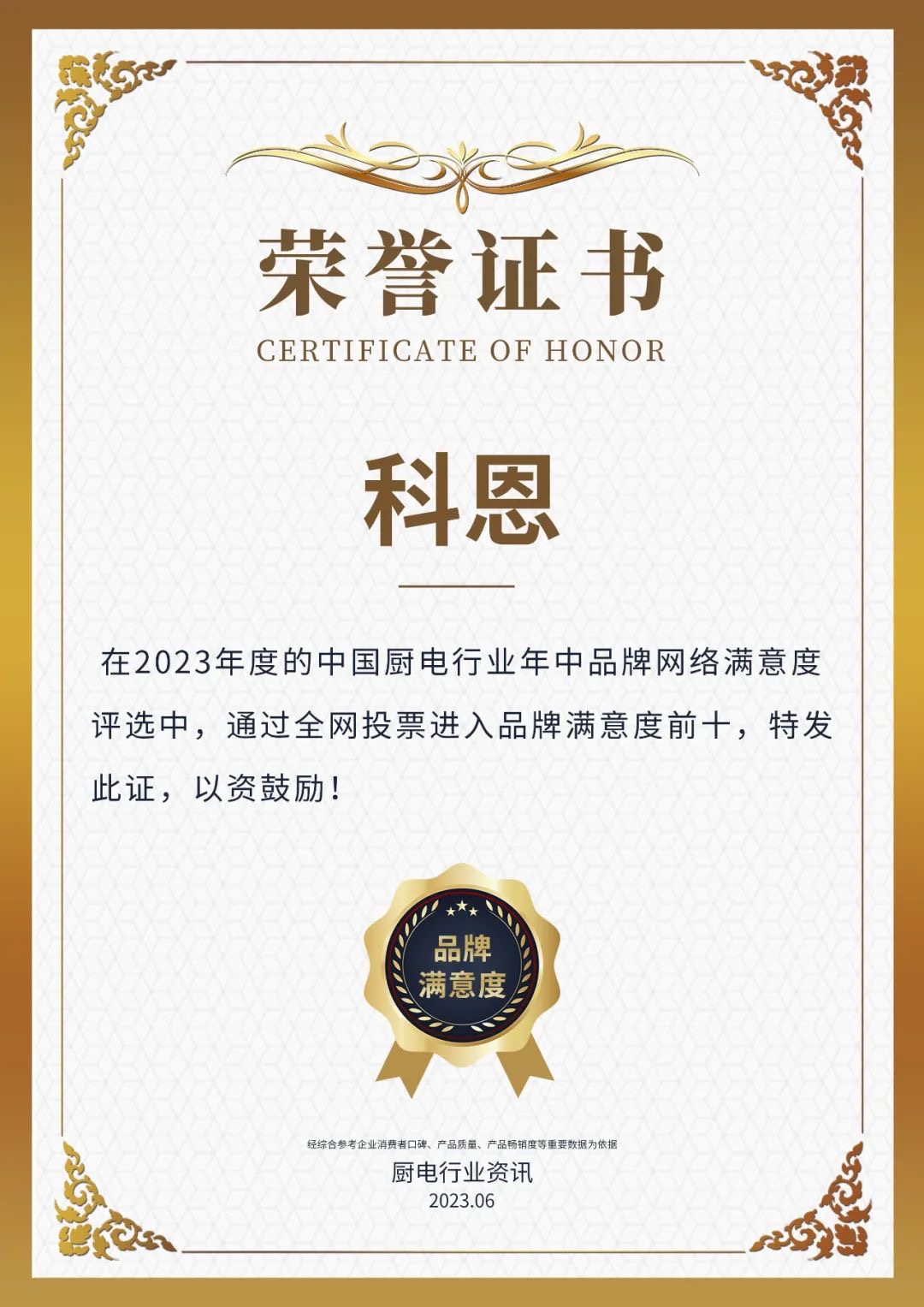 本次榮獲“2023年度中國廚電行業(yè)品牌年中網絡滿意度前十”、“2023年度中國集成灶行業(yè)品牌年中網絡滿意度前十”,再次印證了行業(yè)及消費者對科恩的認可,未來科恩將繼續(xù)秉持初心以產品為原點,深耕行業(yè)。以為中國家庭打造智慧廚房生活,及推動中國廚電行業(yè)發(fā)展繼續(xù)前行!