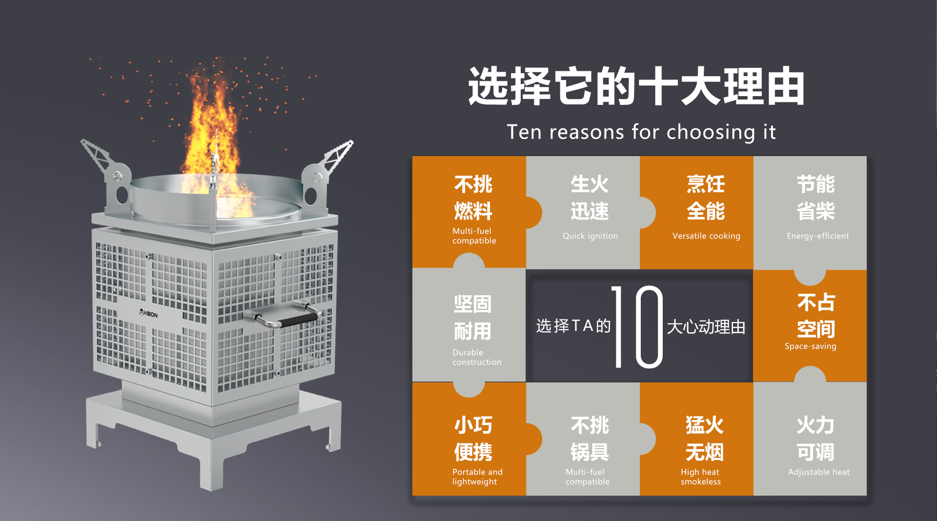 一爐多用,美食無界。不銹鋼鏤空支撐腳,內(nèi)收折疊,穩(wěn)固承重。從山野到河灘,科恩火箭爐S12,一機打造移動米其林廚房,戶外黨終極神器。無煙猛火,征服荒野。收縮添柴口支持雙模切換燃燒,從速燃到持久續(xù)航 ,荒野也能玩轉(zhuǎn)火候,科恩火箭爐S12,重新定義野炊法則。