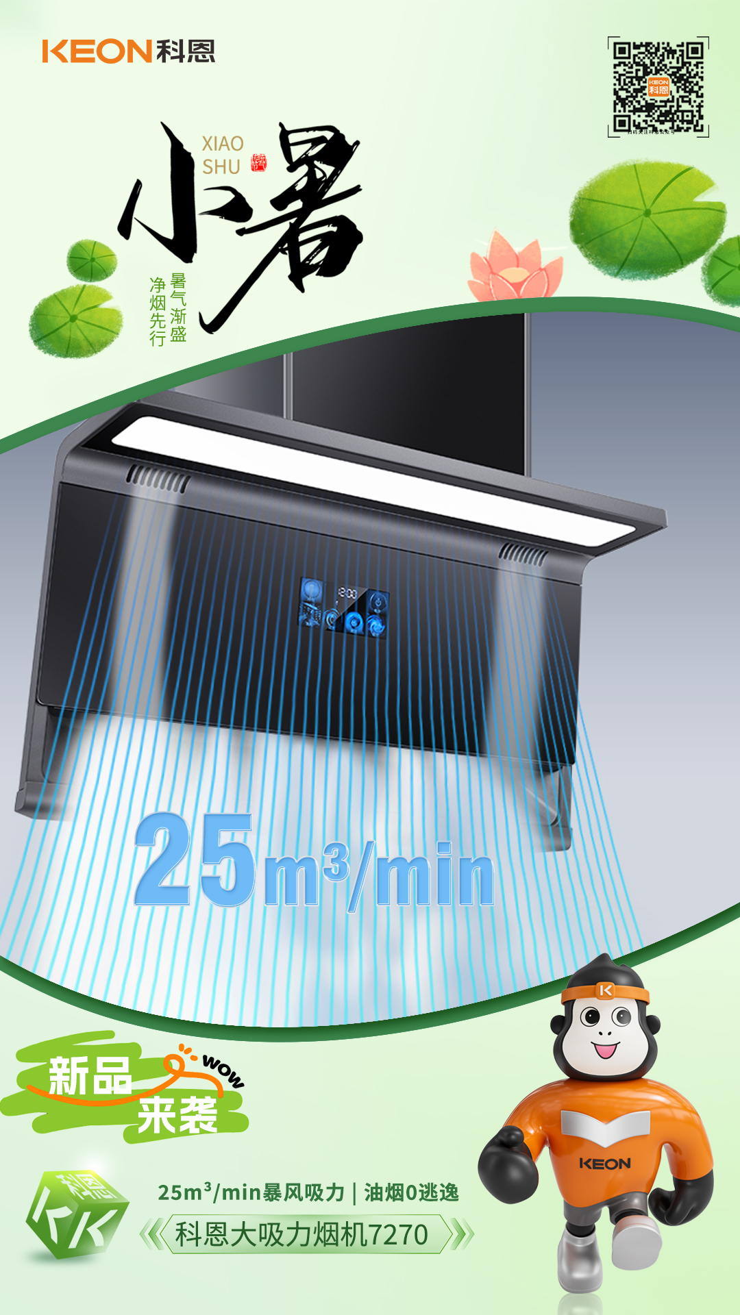 蟬鳴初起,熱浪翻涌。小暑時(shí)節(jié)廚房成高溫重災(zāi)區(qū),油煙升騰中包裹著暑氣更顯煩躁,科恩7270煙機(jī)攜25m³/min暴風(fēng)吸力來襲,為廚房筑起清涼防線,讓凈煙快一步,生活慢享受。
