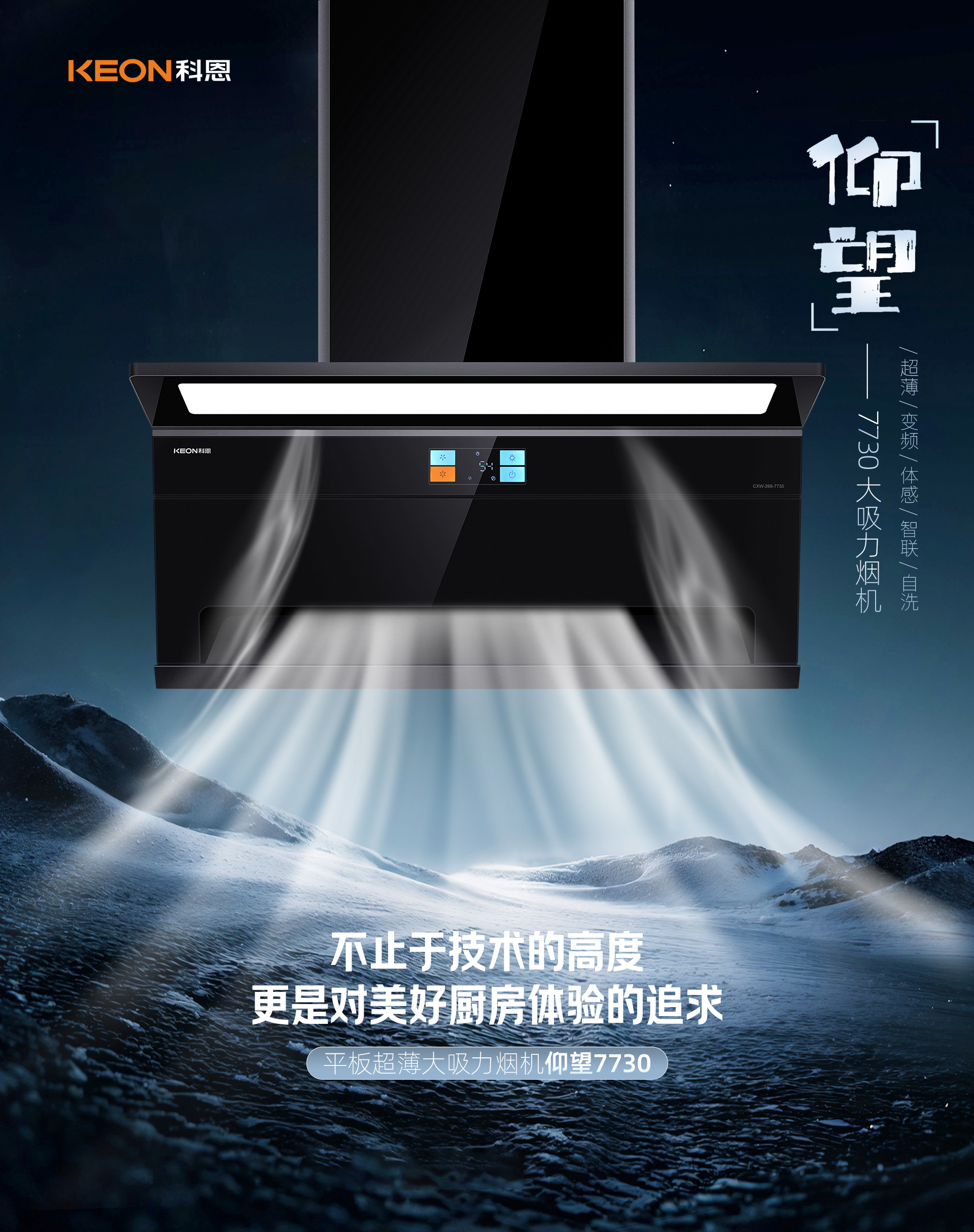 輕薄美學,空間煥新。傳統煙機笨重,廚房逼仄壓抑。科恩7730黑騎士,打破空間桎梏。120°天鵝頸上仰設計,2.0cm超薄視覺。0.5立方敞開空間,翻炒轉身不碰頭,特氟龍一體成型,不沾油污更顯質感。鉆石切割背板,硬朗線條點亮廚房。智控凈吸,告別油膩。爆炒油煙升騰快,傳統煙機難捕捉,24m³澎湃吸力,高位頂吸加側吸,負壓區內傾滑翔設計,凈煙更快更徹底。揮手智控開關機,調節風量不沾油,模塊化彩屏觸控,操作方便簡單,1000Pa強風壓,高峰排煙不倒灌。聯動便捷,清潔無憂。烹飪分心忘開煙機,油煙彌漫難收拾,7730+KN810L煙灶聯動,點火煙機自動啟,磁吸科恩達網板,一拉一提易清潔,電熱自清洗,甩掉油污保吸力,3分鐘延時關機,余煙散盡更健康。IP67全景天幕燈,護眼清晰烹佳肴。
