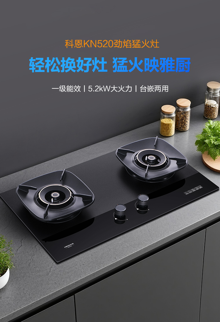 免改煥新,秒換好灶。老舊灶具換裝難,拆改打孔費時間,科恩KN520臺嵌兩用,免改孔徑零門檻,黑色油砂納米面板,油污一擦即凈,高亮旋鈕防燙隔熱,指尖操作更安心。無需折騰舊廚房,煥新只需舉手間,讓老房廚房輕松升級無負(fù)擔(dān)。猛火寬域,味鮮效高。5.2kW三噴猛火,爆炒鎖鮮不留痕,0-170°無極調(diào)火,文火慢燉更入味。上銅下鋁火蓋設(shè)計,導(dǎo)熱均勻不夾生航空級鋁合金燃燒器,耐高溫不易變形,超70%新標(biāo)一級能效,省氣省錢減開支。猛火不費氣,家常也能出大廚味。易潔防爆,安全護航。可拆卸火蓋設(shè)計,深度清潔無死角。鋁合金爐頭防堵防銹,耐用十年依舊新,黑色啞光爐架聚能防風(fēng),火苗穩(wěn)定不跑偏。意外熄火即刻斷氣,湯汁溢出不慌神。防爆抗砸面板加持,廚房安全雙保險。烹飪無憂,健康呼吸伴三餐。