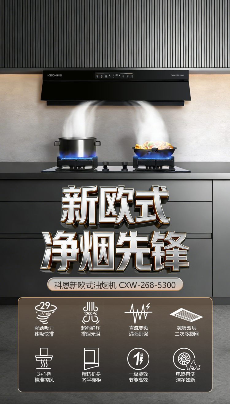 科恩新歐式凈煙先鋒5300,以勁風(fēng)凈煙守護(hù)春日鮮氧,用嵌合美學(xué)點(diǎn)亮廚居風(fēng)景。憑智能潔凈解鎖無憂時光,讓油煙隱于無形,讓美感融于日常,春日出廚有煙火,更有清歡,凈煙入畫,廚居煥新,這才是春日烹飪的理想模樣!