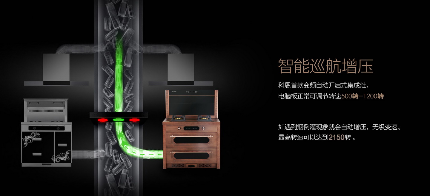 科恩首款變頻自動開啟式集成灶,無級變速。