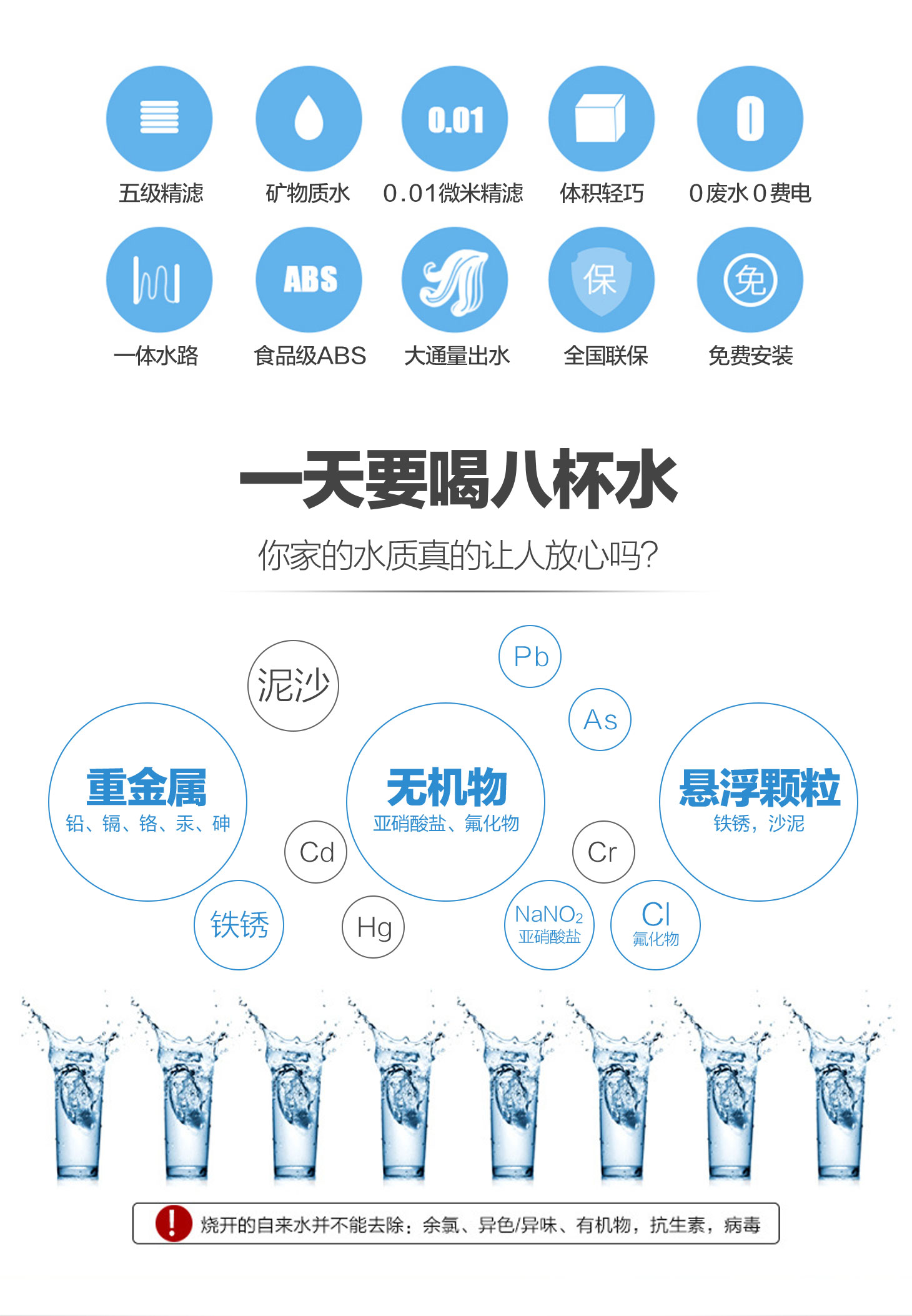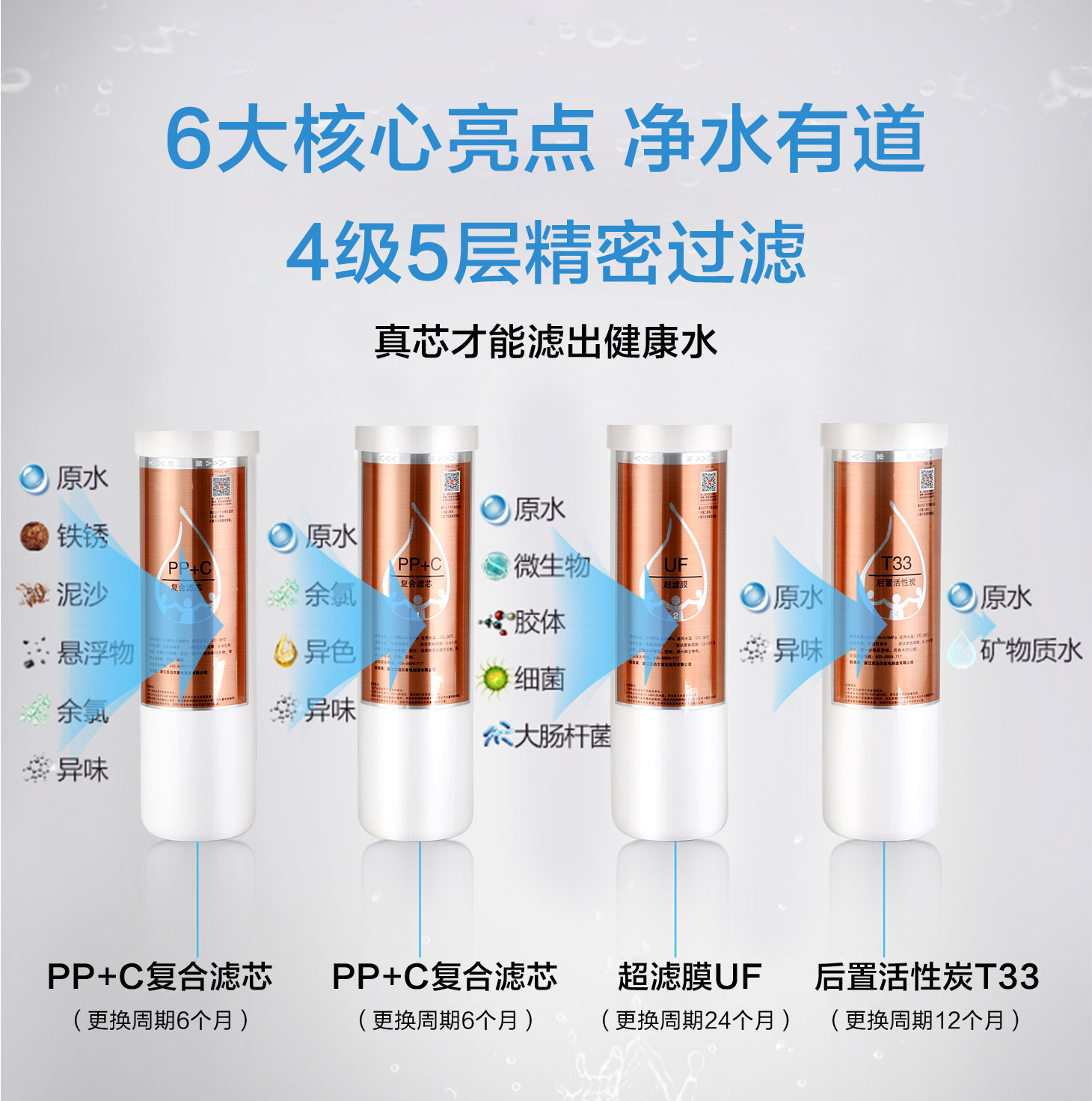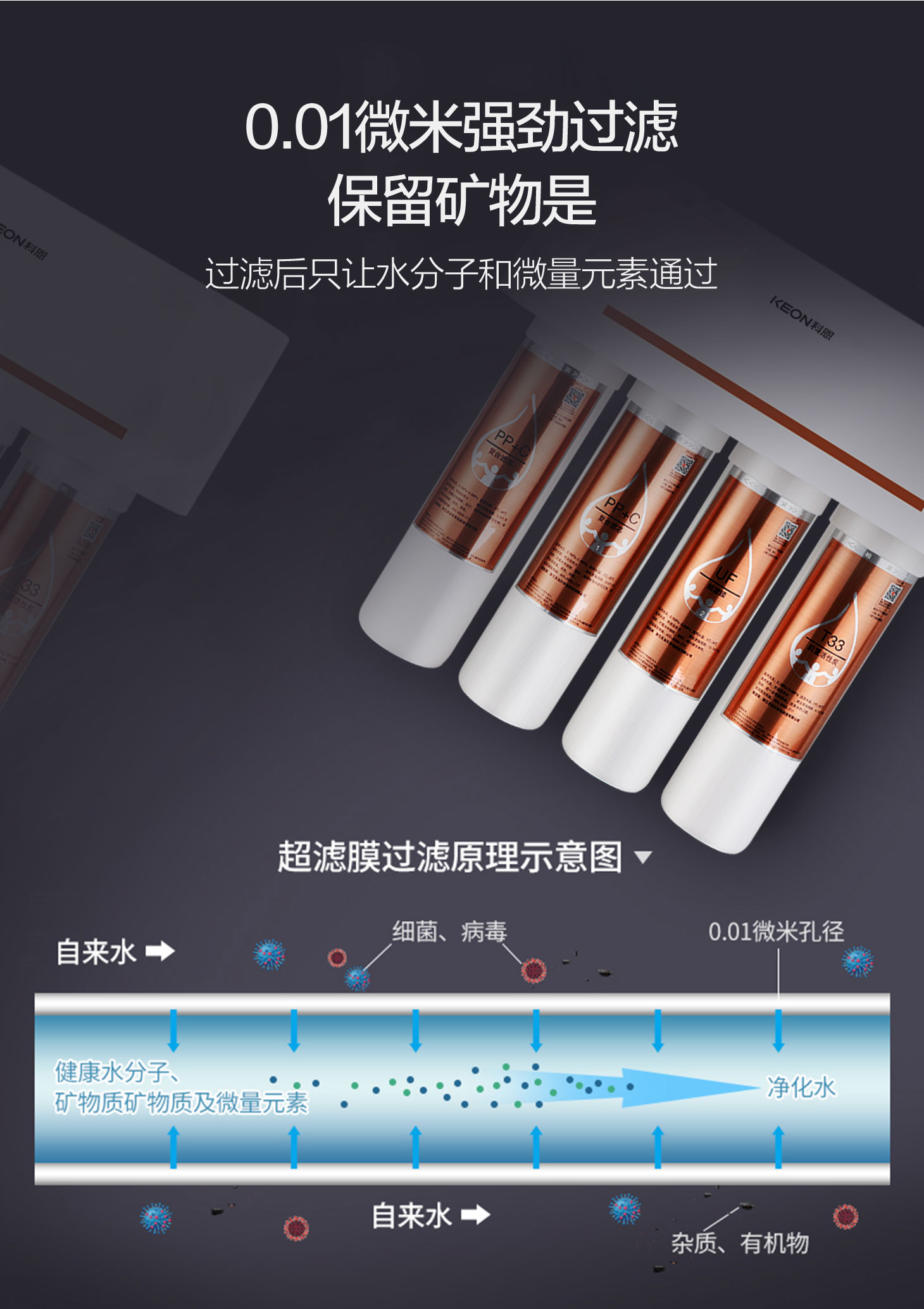 四重五級過濾,0.01微米超濾膜去除細菌和病毒。