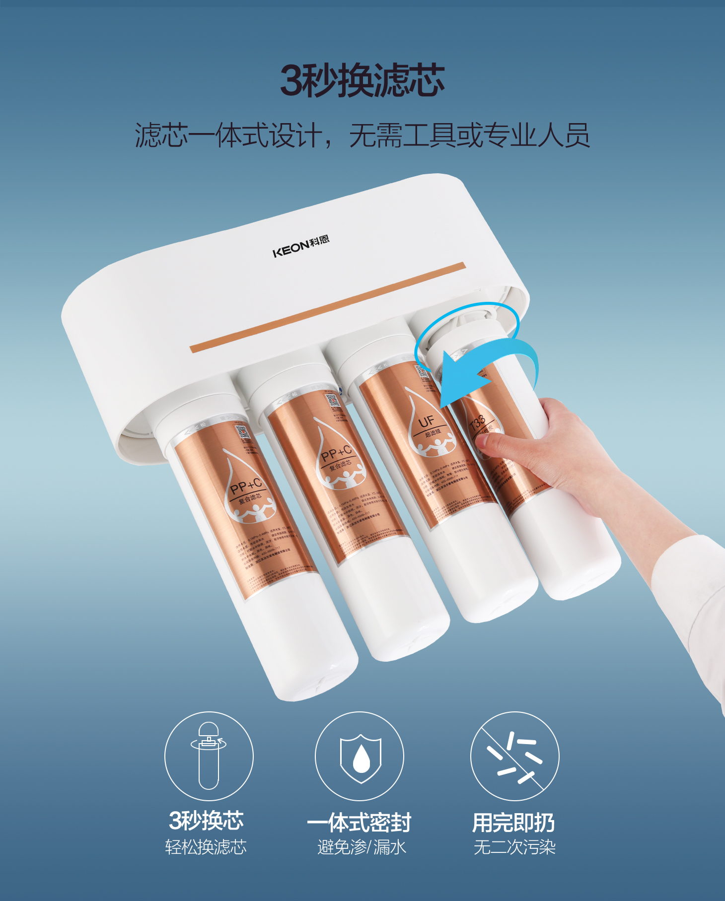 卡接式一體式濾芯,3秒換芯,方便快捷。