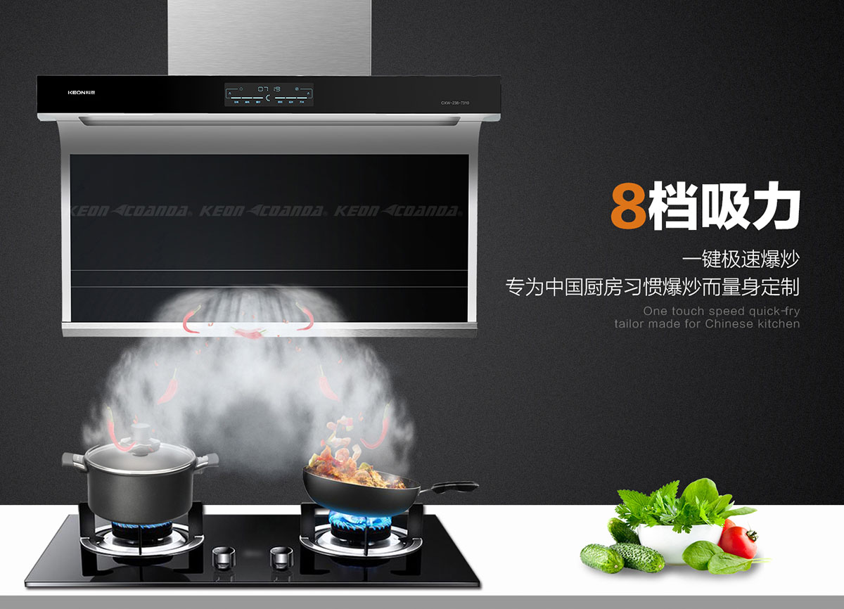 一鍵爆炒,8檔吸力,專為中國廚房習慣爆炒而量身定制。