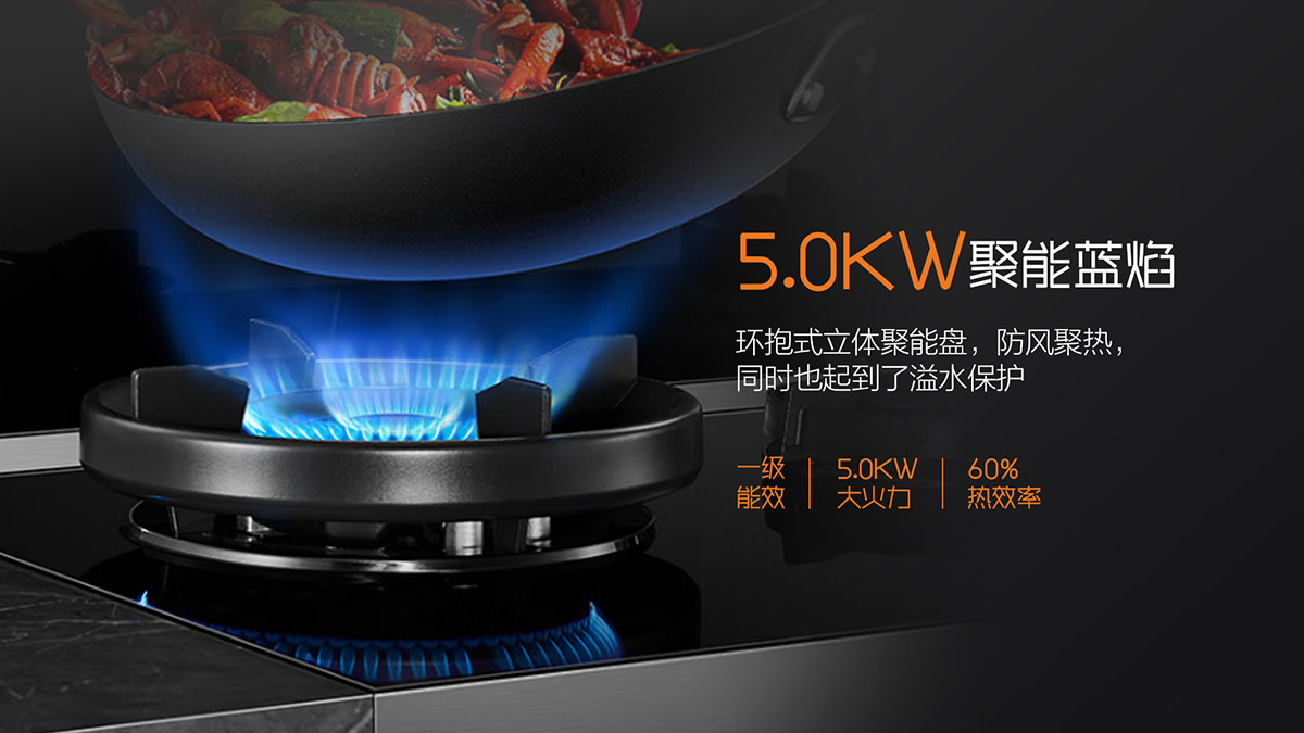 - 環抱式立體聚能環,防風聚熱,熱效率比普通聚能環提升15%
