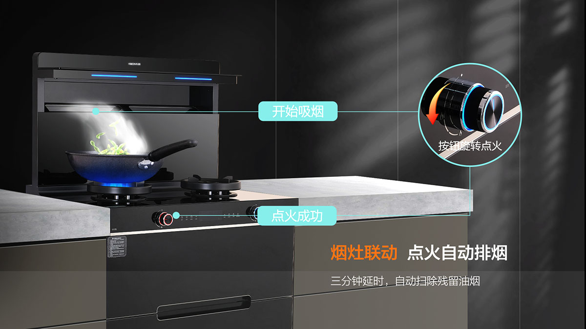 煙灶聯動,點火自動排煙,三分鐘延時,自動掃除殘留油煙