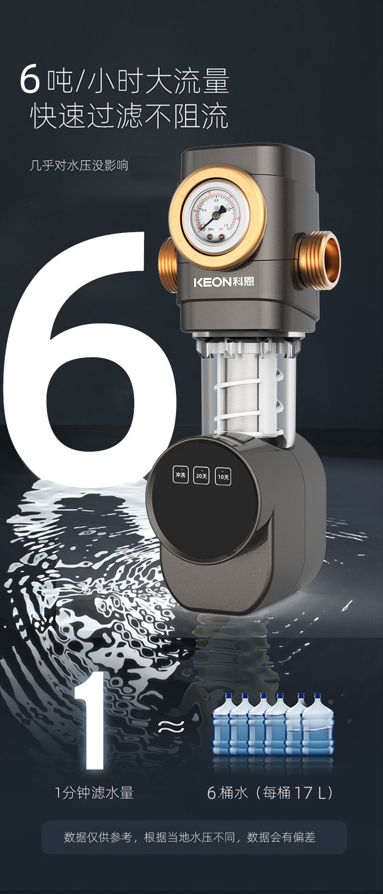 - 6噸/小時大流量,快速過濾,用水無壓力
