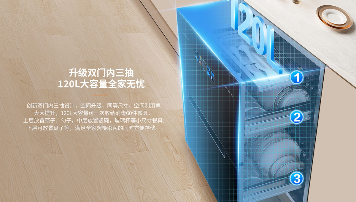 產品型號:ZTD120L-K51(炫彩屏內三抽款)產品名稱:科恩內三抽消毒柜