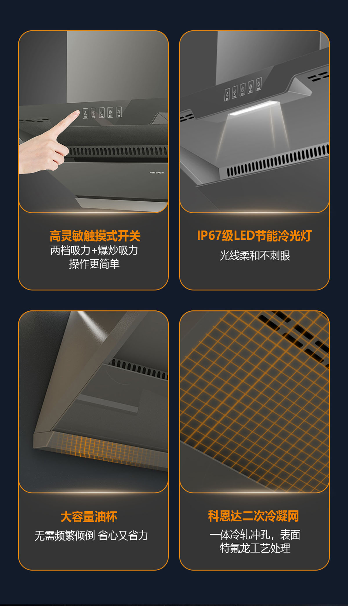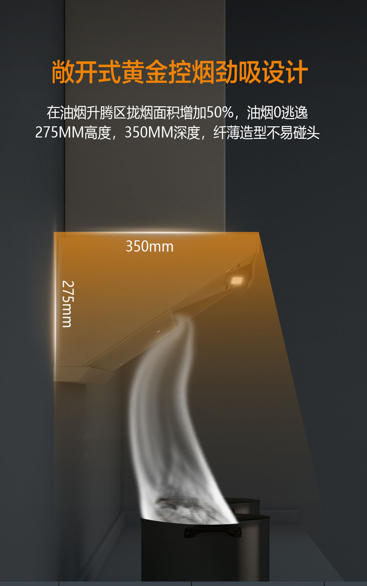 黃金控煙勁吸設計,攏煙面積增加50%,油煙0逃逸