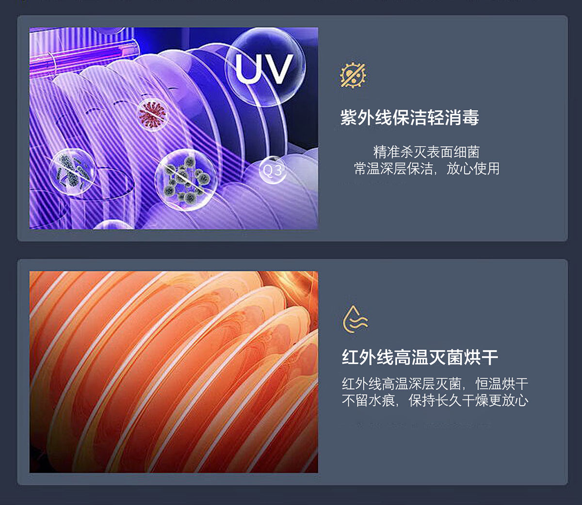 臭氧+紫外線+遠紅外線三重立體消殺,餐具清新又干爽