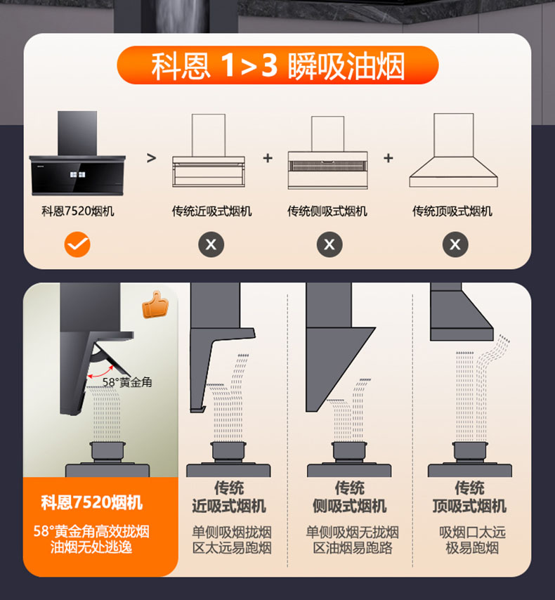 采用58°黃金開合角,緊鎖油煙不逃逸