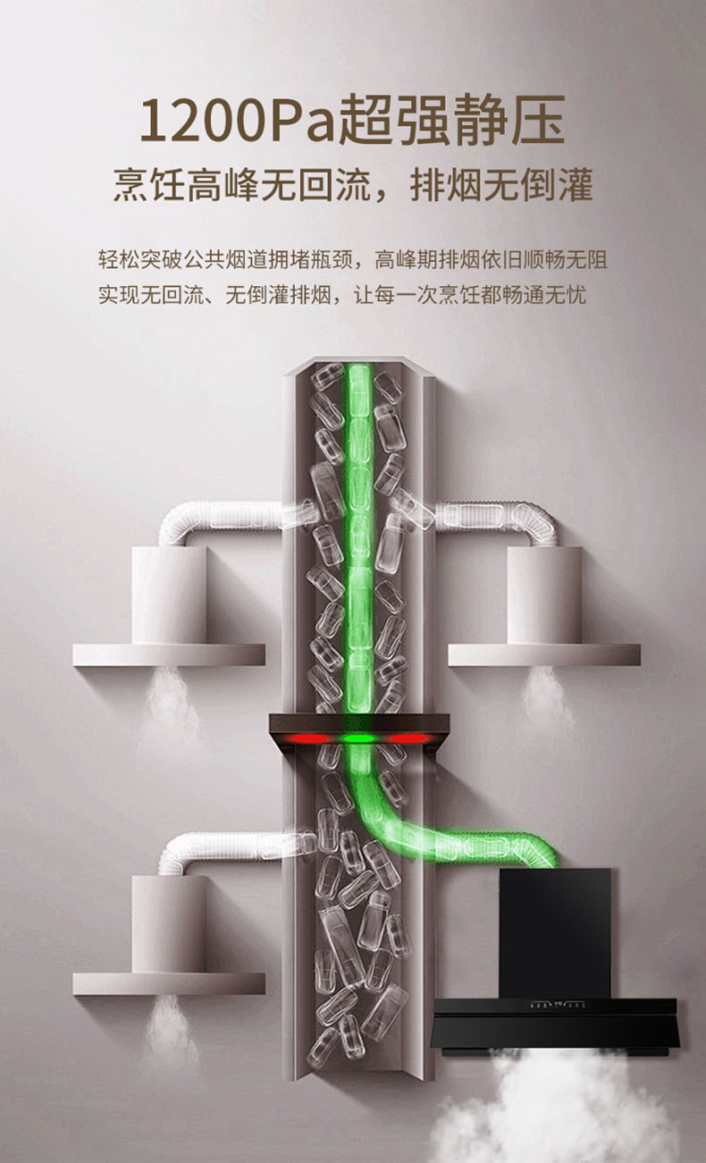 1200Pa超強靜壓,烹飪高峰無回流,排煙無倒灌